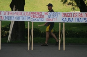 В тот же день примерно 10 человек собрались напротив главного здания Латвийского университета, чтобы выразить свое отношение к преподавателю ЛУ, начальнику управления по делам религий Ринголду Балодису. Пикетчики держали в руках плакаты с надписями: «Студенты ЛУ, вы платите за учебу или за шизофренические лекции Балодиса?», «Лгун Балодис не может работать преподавателем» и так далее.