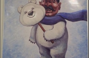 В своем микроблоге Twitter он опубликовал плакат, на котором изображен символ Олимпийских игр в сочи - белый медведь с головой Иосифа Сталина.
