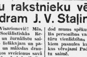 В тот же день было опубликовано письмо латышских писателей Сталину : «Дорогой Иосиф Виссарионович! Мы, семья писателей и журналистов Латвийской Советской Социалистической Республики, шлём Вам -величайшему и истинному другу культуры и искусства - сердечнейший привет на своем первом профсоюзном собрании в свободной Советской стране. Мы благодарим вас за освобождение наших писателей для творческого труда…» и т.д.