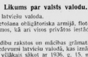 9 января 1935 года в газете «Валдыбас Вестнесис» был опубликован, и вступил в силу, первый Закон о государственном языке, подписанный 5-го января президентом министров Карлисом Улманисом. Государственным языком объявлялся латышский, за сознательное нарушение закона устанавливался штраф до 1000 латов или арест до 3-месяцев или всё вместе.