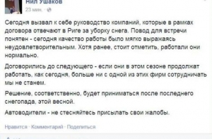 Мэр Риги Нил Ушаков выразил недовольство работой предприятий, занимающихся уборкой снега в столице. Об этом градоначальник написал на своей странице в Facebook.