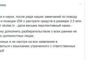 “Министр образования и науки, после ряда наших замечаний по поводу служебной проверки и позиции МОН о растрате средств в размере 3,5 млн EUR, осваивая проект skolas.lv, дала весьма перспективный наказ. Министр сообщила о необходимости дополнить служебную проверку разбирательством о всех раннее не упомянутых (скрытых) должностных лицах. А также посчитала необходимым выявить ответственных и, несмотря на все заявления в Генпрокуратуру, готовиться к взысканию утраченного с ответственных через гражданский суд”, - пишет Эклсниньш.