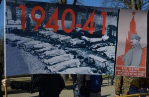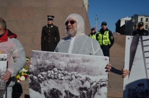После возложения цветов участники выстроились у подножия памятника Свободы и у каждого в руках были фотографии с убитыми евреями и другими мирными жителями. Также на одном из плакатов были изображены латышские легионеры у флага фашистской Германии.