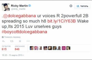Несколько часов назад Рики Мартин, имеющий в своем Твиттере около 12 миллионов подписчиков, написал, обращаясь к дуэту модельеров: «Ваше заявление распространяет столько ненависти! На дворе 2015 год, проснитесь! Полюбите себя, ребята!». Как и все, в конце сообщения Рики добавил хэштег #boycottdolcegabbana.