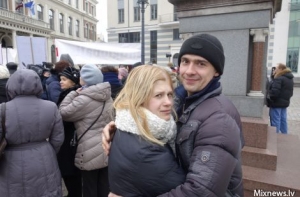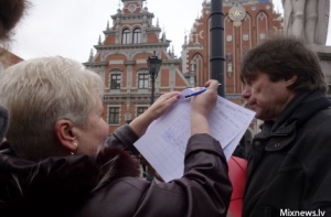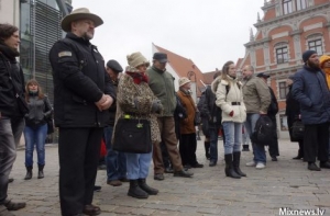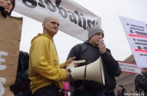 В свою очередь, председатель правления организации «Антиглобалисты» высказал свою позицию при помощи громкоговорителя. Затем к нему присоединилась Кристине Лиепиня, автор письма, которое организация намерена подать в Рижскую думу.
