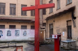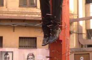Напомним, в конце прошлой недели во дворе Углового дома, бывшего здания КГБ на улице Стабу появилась инсталляция в виде распятой на кресте куклы, похожей на Владимира Путина. Как выяснилось, данная инсталляция была частью выставки «Диссидент».