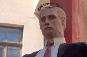 На вопрос о том, как организаторы выставки относятся к мнениям, что инсталляция с распятой на кресте куклой похожа на президента России Владимира Путина, Янсонс подчеркнул, что искусство каждый может интерпретировать по-своему.