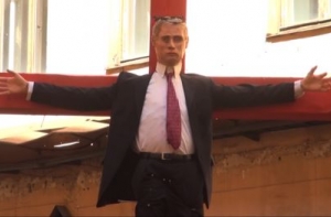 В конце прошлой недели во дворе Углового дома, бывшего здания КГБ на улице Стабу появилась инсталляция в виде распятой на кресте куклы, похожей на Владимира Путина. Как выяснилось, данная инсталляция была частью выставки «Диссидент».