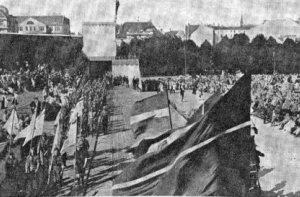 18 июня 1922 года в Риге начался первый Праздник латвийской молодёжи. Он открылся концертом в церкви св. Гертруды и шествием по Николаевской улице до Эспланады. Впереди ехали трубачи, всадники в исторических древнелатышских военных одеждах и с флагами в руках. За ними следовали ученические оркестры. На празднике присутствовали министры и президент Чаксте. После шествия и речей состоялось выступление хоров и представление в Национальной опере. Во время праздника на Эспланаде были разбросаны прокламации, подписанные союзом коммунистической молодежи и озаглавленные «Под знаменем коммунизма» и «К латвийской трудовой молодежи», сообщила газета «Сегодня».
