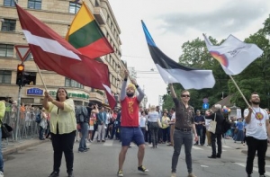 Также над колонной развевались латвийские, российские, украинские, литовские и эстонские флаги. У многих участников были повязаны цветные шарфы, а некоторые держали в руках разноцветные шарики.