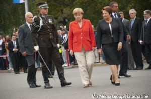 18 августа 2014 года в Латвию с визитом прибыла канцлер ФРГ Ангела Меркель. На пресс-конференции она заявила, что считает санкции Евросоюза против России необходимым шагом и отметила, что понимает обеспокоенность жителей Латвии действиями их «восточного соседа». Канцлер Германии также зачитала письмо латвийской интеллигенции, в котором они призывали канцлера разместить на территории Латвии базы НАТО. Канцлер довольно уклончиво комментировала эту просьбу, напомнив о существовании 5 пункта договора НАТО, который подразумевает защиту в случае нападения на одну из стран альянса.