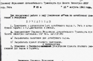 26 августа 1946 года был издан приказ Главного управления автомобильного транспорта при Совете министров Латвийской ССР о создании 1-го Рижского автобусного парка. Предприятие получило 16 автобусов, использовавшихся только на междугородных маршрутах. До 1951 года автобусный парк находился на улице Калнциема, 40.