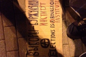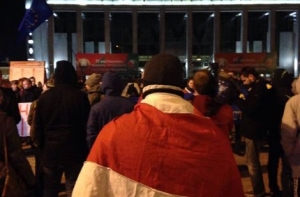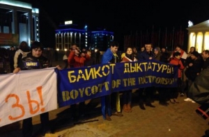 Как отмечается, участники акции развернули флаги Евросоюза, бело-красно-белые флаги, транспарант с призывом бойкотировать выборы.
