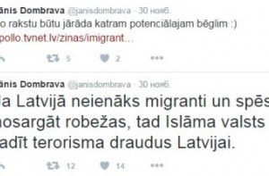 «Если в Латвию не приедут мигранты и если мы сможем охранять границы, то Исламкое государство не сможет создать террористическую угрозу в Латвии», - написал политик в Twitter.