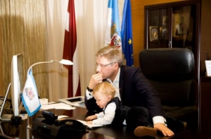 Мэр Риги Нил Ушаков на своей странице в социальной сети Facebook опубликовал фото со своим маленьким сыном Томом на работе, подписав снимок **»Piektdienas vakars darbā. / На работе в пятницу вечером»**.