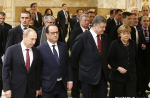 12 февраля 2015 года в столице Белоруссии был подписан «Комплекс мер по выполнению минских соглашений», существенно дополнявший и конкретизировавший протокол и меморандум. Документ предусматривает режим прекращения огня, отвод тяжелых вооружений от линии соприкосновения, проведение конституционной реформы (со вступлением в силу к концу 2015-го новой конституции), законодательное закрепление особого статуса отдельных районов Донецкой и Луганской областей и новый пункт об обмене пленными на основе принципа «всех на всех». Разработкой минских соглашений занималась «нормандская четверка» (России, Украины, Германии, Франции) Владимир Путин, Петр Порошенко, Ангела Меркель и Франсуа Олланд.