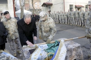 4 февраля 2015 года президент Андрис Берзиньш на торжественной церемонии вручил знамя подразделения Командованию обеспечения. Церемония прошла в штабе командования по адресу Венибас Гатве 56 в Риге. Автором художественного решения знамени является художница Аусма Апша. На правой стороне флага, на серебряном фоне, который символизирует богатство земли, мудрость и развитие, вышита эмблема вооружённых сил, над ней – надпись «Национальные вооружённые силы», под ней – «Командование обеспечения». По углам отображены народные орнаменты – знак счастья, усиньш (божество света и весны) и двойной крест. На левой стороне, на основе, окрашенной в три цвета – светло-синий, зелёный и тёмно-зелёный, которые символизируют виды вооружённых сил, вышита эмблемы Командования обеспечения, над нею – девиз командования «Мы обеспечиваем победу», в под нею – год создания «2001».
