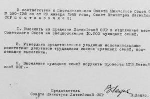 17 марта 1949 года председатель Совета Министров Вилис Лацис подписал постановление о выселении из пределов Латвийской ССР 10 000 кулацких семей.