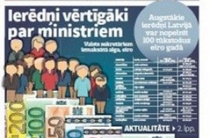 Газета Neatkarīgā пишет о зарплатах высших чиновниках, которые зарабатывают по 100 тысяч евро в год. Речь о парламентских секретарях министерств, которые богаче самих министров, газета публикует суммы секретарских зарплат за прошлый и позапрошлый годы, у всех повысилось, кроме МИДа. Также можно почитать о готовящихся протестах медиков, о прекращении государственной поддержки нянь и частных детских садов, а также есть большое интервью с Марисом Пукисом, старшим советником Союза самоуправлений, ветераном Атмоды, Он рассказывает про территориально-административную реформу и о том, почему она все никак не заканчивается.