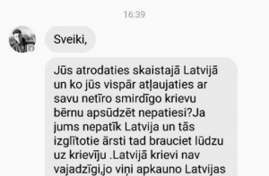 «Здравствуйте. Вы находитесь в красивой Латвии, что вы вообще позволяете себе со своим вонючим русским ребенком здесь оспаривать? Если вам не нравится Латвия и ее образованные врачи, поезжайте, пожалуйста, в Россию. В Латвии русские не нужны, они позорят Латвийскую Республику. Как вы вообще могли тут выложить мысли и замечания Сандры Карклини? Вы поступаете низко и противно, как и все русские», - написал Риналдс Друвиньш.