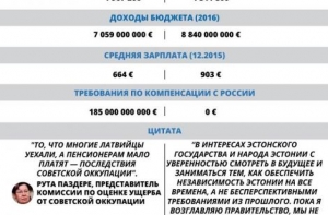 В пример он привел таблицу, в который сравниваются показатели Латвии и Эстонии - численность населения, доходы бюджета, средняя зарплата и требования компенсации с России за оккупацию СССР.