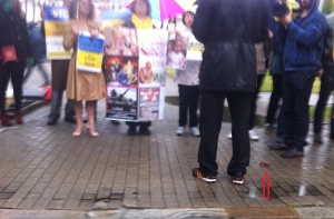 Участники пикета поют гимн Латвии, в руках держат украинские и латвийские флаги, а также плакаты: «Стоп Путин, стоп война!», «Остановите Путина», «Империя зла», «За свободную и национальную Украину!» и другие. Как можно увидеть на фото с данного мероприятия, участники принесли с собой также георгиевские ленточки, одна из которых лежит на земле.