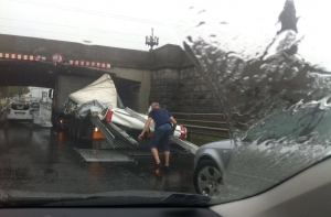 Водитель не рассчитал высоту моста и габариты прицепа.