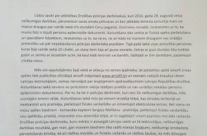 «Прошу привлечь к ответственности сотрудников Полиции безопасности, которые 28 августа 2016 года произвели противоправные действия, превысив свои служебные полномочия и без каких-либо причин задержали меня и моих друзей на более чем три часа в Озолниекском крае, несмотря на то, что у нас с собой были удостоверяющие личность документы. При задержании использовалась физическая сила, а также специальные средства, несмотря на то, что ни я, ни мои друзья не оказывали сопротивления», - написал Росликов.