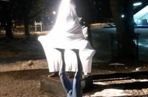Как уже сообщалось, вечером 24 января в рамках художественного эксперимента студенты Академии художеств замотали белой тканью памятник Пушкину в парке Кронвалда, а рядом установили перевернутый манекен.