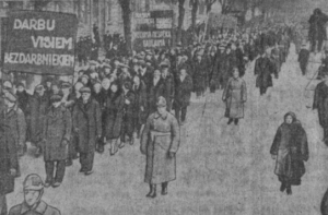16 февраля 1933 года в Риге прошла массовая демонстрация безработных, организованная Центральным бюро профсоюзов и Социал-демократической партией. Демонстранты отправились к министерству иностранных дел и госканцелярии, где делегатов демонстрантов принял премьер-министр М. Скуениекс и рассказал о средствах, выделенных на борьбу с безработицей.