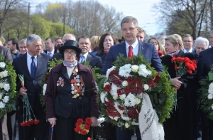 В первом ряду вместе с мэром города Нилом Ушаковым цветы возложили ветераны Латвийских партизанских отрядов. За ними следовали должностные лица, среди которых депутаты Сейма и Европарламента, а также представители Рижской думы и послы России, Беларуси, Азербайджана и Казахстана в Латвии.