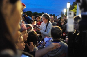 Затем Алена спустилась к встречавшим ее у входа в терминал, раздала автографы, сфотографировалась со всеми желающими и приняла в подарок цветы.