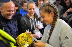 Самолет с Аленой и ее мамой, тренером Еленой Яковлевой приземлился в VIP-терминале Рижского аэропорта в 22:15. Алена спустилась по трапу самолета с победным кубком в руках и раздала автографы допущенным к трапу юным теннисистам.
