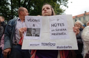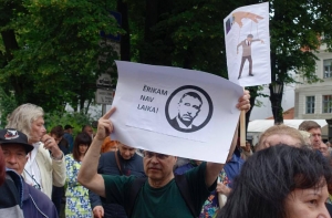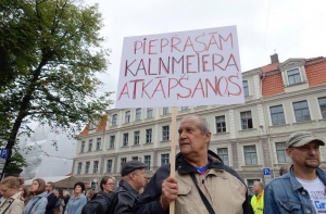 Около 150 человек в четверг утром собрались на пикет у здания Генеральной прокуратуры, чтобы потребовать отставки генерального прокурора Эрика Калнмейерса в связи с так называемыми «переговорами олигархов».