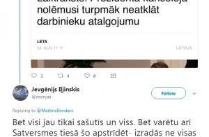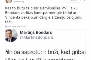 «Кто бы говорил! Все уже забыли про траты руководимой Бондарсом канцелярии президента ВВФ в ресторане Vincent и дорогие зарубежные поездки, однако голосование против публикации зарплат чиновников все еще в памяти. Господин ищет дешевую популярность. Других вариантов в его ситуации нет», - пишет Андра.