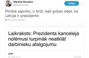 Иногда стыдно за президента Латвии, указал Мартиньш Бондарс, комментируя информацию о том, что канцелярия президента впредь не будет раскрывать данные о зарплатах сотрудников. Об этом политик написал в своем аккаунте в социальной сети Twitter.