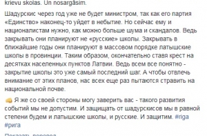 «Шадурскис через год уже не будет министром, так как его партия «Единство» наконец-то уйдет в небытие. Но сейчас ему и националистам нужно, как можно больше шума и скандалов. **Ведь закрывать они планируют не «русские» школы. Закрывать в ближайшие годы они планируют в массовом порядке латышские школы в провинции. Таким образом, окончательно ставя крест на десятках населенных пунктов Латвии.** Ведь всем все понятно - закрытие школы это уже самый последний шаг. А чтобы отвлечь внимание от этих планов, нас всех еще раз пытаются стравить на национальной почве», - пишет Ушаков.