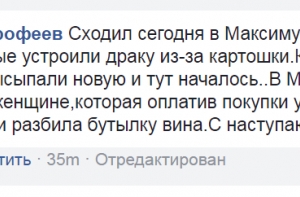 «Сходил сегодня в Максиму - разнял двух бабушек,которые устроили драку из-за картошки. Картошка закончились, высыпали новую и тут началось.. В Мего вызвал скорую одной женщине, которая, оплатив покупки упала в обморок прямо у кассы и разбила бутылку вина. С наступающим!», - написал Дорофеев.