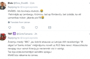 «Зарубежное «BBC», уже сейчас отзывается на неудачные попытки Минобороны Латвии назвать «Сагу с прослушкой олигархов» и «банковский кризис» российскими fake news! В сюжете говорится, что не надо везде винить Россию, поскольку она не всегда виновата. Это было в новостях про отравленного шпиона! KNAB будет следующим!», - пишет еще один пользователь.