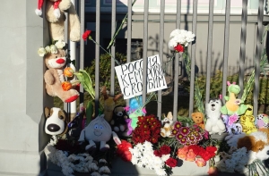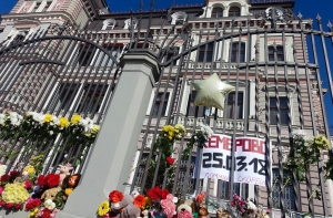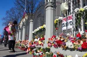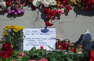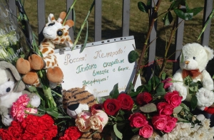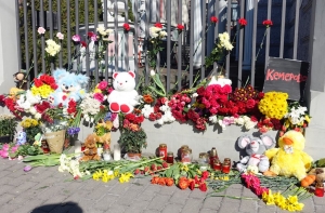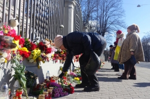 Жители Латвии несут к стенам посольства России цветы и детские игрушки в память о погибших. Люди выражают соболезнования родственникам и близким погибших, большинство из которых были дети.
