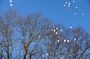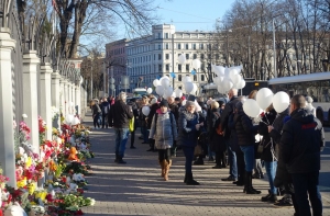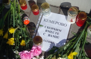 Несколько десятков людей собралось около посольства России в Латвии, чтобы запустить белые воздушные шары в память о погибших при пожаре в ТРЦ «Зимняя вишня» в российском городе Кемерово.