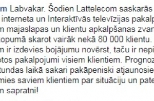 «В субботу Lattelecom столкнулся с сетевой аварией, которая затронула услуги интернета и интерактивного телевидения. Это повлияло на работу 177 центров обслуживания телефонных вызовов, а также затронуло более чем 80 000 клиентов. Мастерам Lattelecom удалось устранить повреждение, однако необходимо время, чтобы связь возобновилась у всех клиентов. По нашим прогнозам, в ближайшие часы связь постепенно восстановится у всех. Мы приносим извинения своим клиентам и благодарим их за поддержку и понимание», - написал Lattelecom в комментарии радио Baltkom после 22.00.