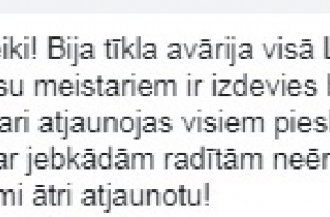 «Во всей Латвии произошла сетевая авария с присвоением IP-адресов. Нашим мастерам удалось устранить повреждение и постепенно, связь у всех восстанавливается. Еще раз приносим извинения за любые причиненные неудобства – мы делаем все, чтобы по возможности быстрее восстановить связь!», - отметил Lattelecom.