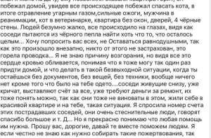 «Когда хозяину позвонили и сообщили, что горит его квартира, то он вернулся домой и побежал спасать кота. В итоге мужчина получил ожоги, отравился угарным газом. Сейчас он находится в больнице. Кот - в ветеринарной клинике. Квартира в ужасном состоянии – все сгорело, все стены черные. Сейчас в этом месте жить нельзя», - написала она.