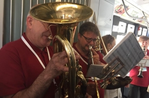 Участники Вселатвийского праздника песни и танца выступают не только на сценических площадках, но и в общественном транспорте. Пользователи соцсетей периодически делятся своими впечатлениями. На этот раз житель Риги Артем Туманов выставил фото и видеосюжет, снятый им в трамвае 11 маршрута, где участники оркестра устроили импровизированный концерт.