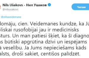 «Я думаю, уважаемая госпожа Вейдемане, у вашей публичной русофобии медицинский характер. Мне на самом деле кажется, что этот диагноз серьезно осложняет жизнь и ухудшает здоровье. Если Вам необходима поддержка, смело говорите, постараюсь помочь», - написал Ушаков.