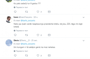 «За последние 8 лет ни один из депутатов никогда не позволил себе использовать для голосования место президента Латвии в задле Сейма. До сегодняшнего дня, когда это сделал … ну, сами знаете кто», - написал Карлис Сержантс в Twitter, сопроводив свой пост фотографией, на которой запечатлен в момент голосования Артусс Кайминьш.
