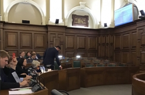 Депутат 12-ого Сейма, который по результатам голосования в 13-ый Сейм не попал Карлис Сержантс, на одном из последних заседаний сфотографировал лидера партии KPV LV Артусса Кайминьша, голосующего с президентского места, указывая, что до сих пор никто не позволил себе такую вольность.
