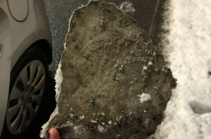 «Мы ехали под мостом, в третьем ряду, тут услышала громкий звук, что-то ударило по крыше автомобиля. Ситуация непривычная - жму на тормоз, останавливаю машину и включаю аварийные сигналы. Вышла, смотрю, а за моим авто валяются куски бетона. На крыше автомобиля тоже лежали бетонные обломки», - написала Инга.