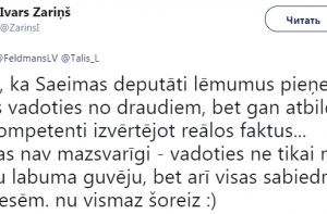 «Надо надеяться, что депутаты Сейма принимают решения руководствуясь не угрозами, а ответственно и компетентно оценивая реальные факты… и что не мало важно - руководствуясь не только интересами узкого круга получателей выгоды, а в интересах всего общества. Ну по крайней мере на этот раз», - написал Ивар Зариньш.